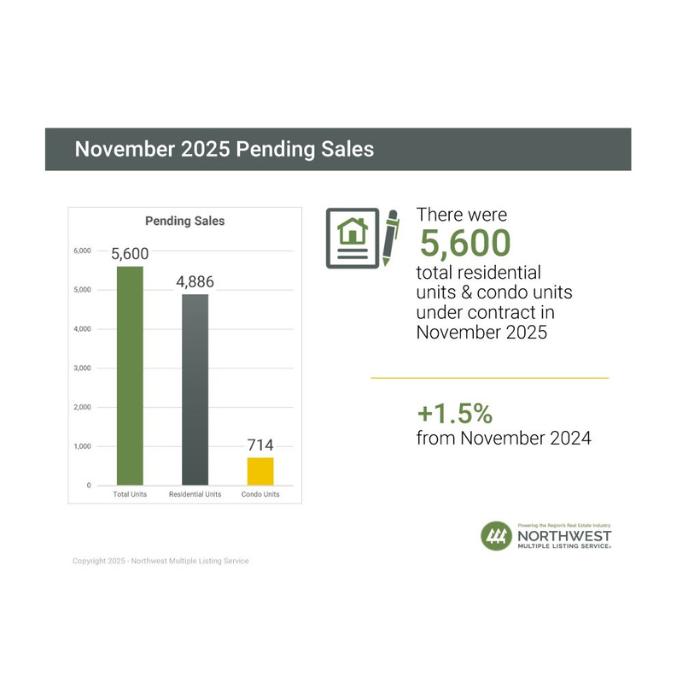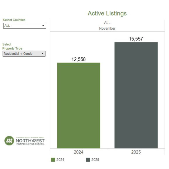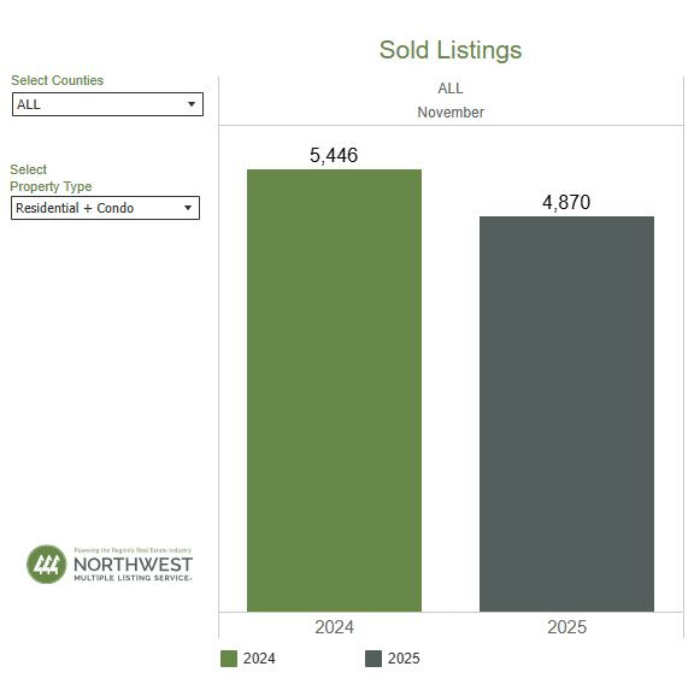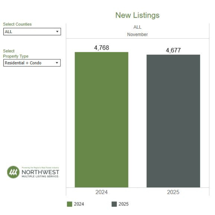 NWMLS brokers added 4,677 new listings to the database in November 2025, a year-over-year decrease of 1.9% compared to November 2024 (4,768). When compared to the previous month (October 2025), new listings decreased by 41.5%, when 7,991 listings were added to the NWMLS database.
