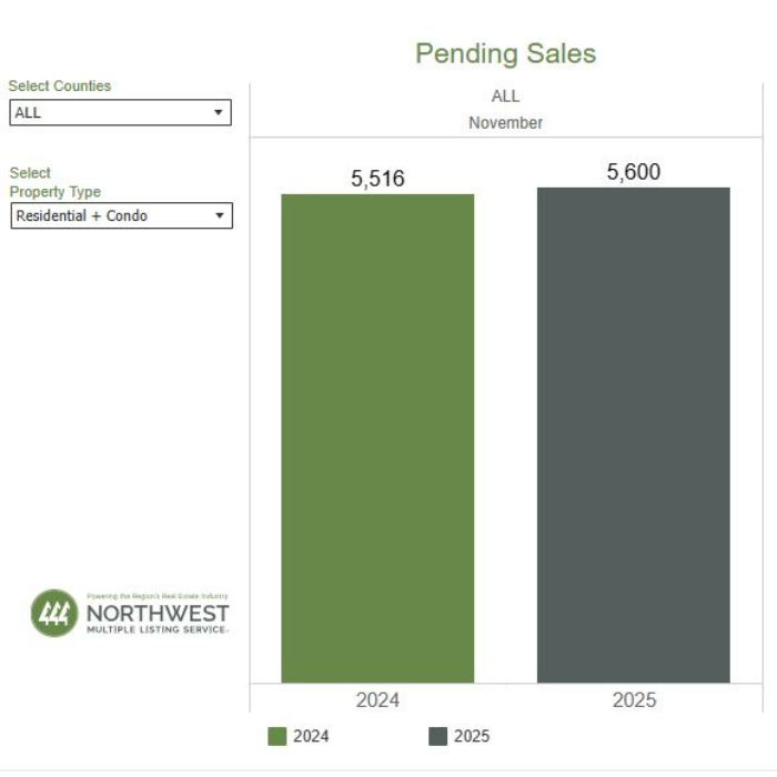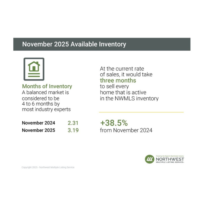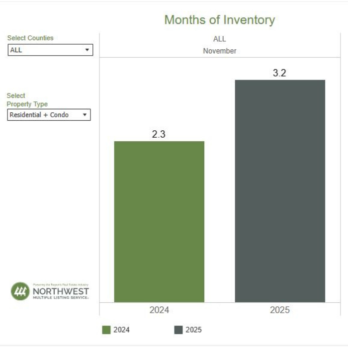 A balanced market is considered to be 4 to 6 months by most industry experts. At the current rate of sales, it would take a little more than 3 months (3.19) to sell every home that is active in the NWMLS inventory. The six counties with the lowest months of inventory in November 2025 were Kitsap (2.24), Snohomish (2.28), King (2.82), Pierce (2.85), Island (3.03), and Thurston (3.03).