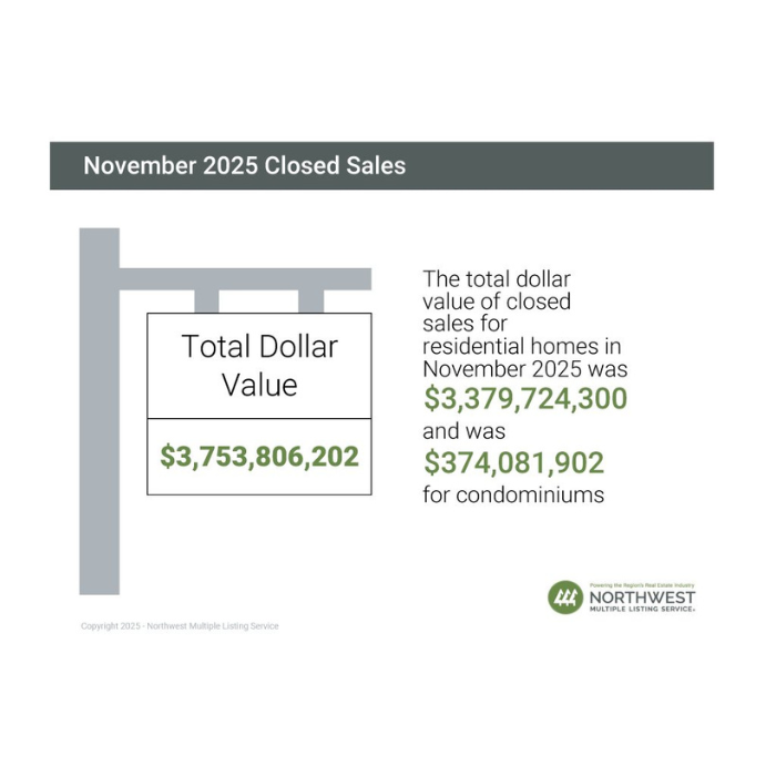 18 out of 27 counties saw a decrease in the number of closed sales year-over-year, while 6 saw an increase, and 3 showed no change. The six counties with the largest decreases were Okanogan (-34.3%), Chelan (-26.7%), Skagit (-23.2%), Kitsap (-20.1%), Mason (-14.6%), and Snohomish (-14.6%). The total dollar value of closed sales in November 2025 for residential homes was $3,379,724,300 and was $374,081,902 for condominiums ($3,753,806,202 in total).